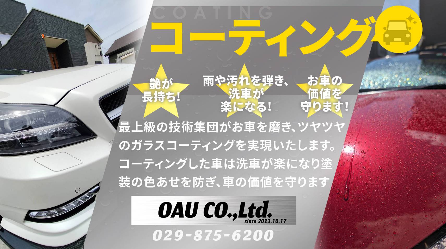 技術集団がお車を磨き、ツヤツヤのガラスコーティングを実現いたします。コーティングした車は洗車が楽になり塗装の色あせを防ぎ、車の価値を守ります。