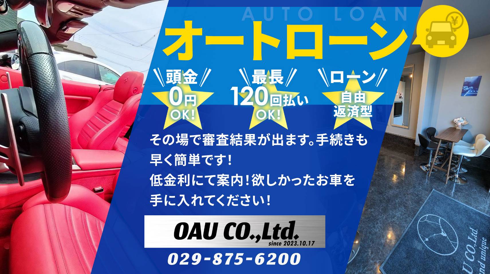 • OAUは谷田部ICから約5分!品質にこだわった厳選車を取り揃えております。**信用回復ローン・自社ローンのご相談も承ります。**営業時間10:00~19:00