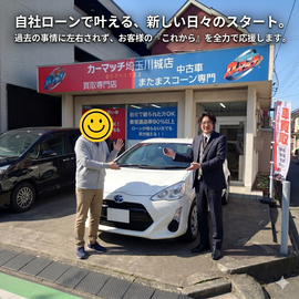 「審査落ちの連続で諦めていましたが、ここは違いました」 「数年前の借金でブラックリスト入り。仕事のためにどうしても車が必要でしたが、どこの中古車店でもローンを断られました。カーマッチ埼玉川越店さんは、私の今の仕事の状況や、これからの返済計画をじっくり聞いてくれました。 提案されたのは、燃費の良いコンパクトカー。最初は物足りないかと思いましたが、実際に乗ってみると維持費が安く、今の自分にはこれが正解だったと確信しています。納車の日、ピカピカの車体を見て涙が出そうになりました。」